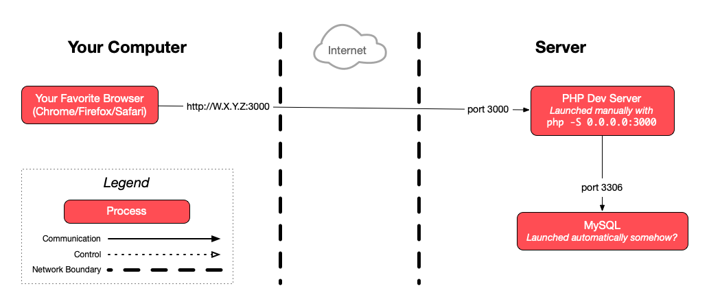 Traditionally, PHP is deployed using the Apache web server, which is a generic web server and reverse proxy but is also capable of executing PHP code. To simplify things in this exercise, we will not install Apache, but instead execute the PHP application directly from the command line using the simpler PHP development server.