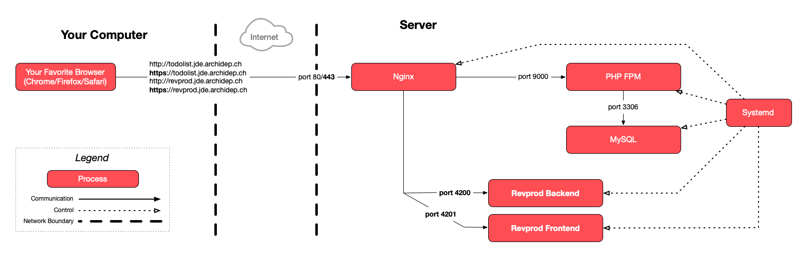 This diagram shows the processes involved in all previous exercises, meaning those related to the PHP todolist and the revprod applications.